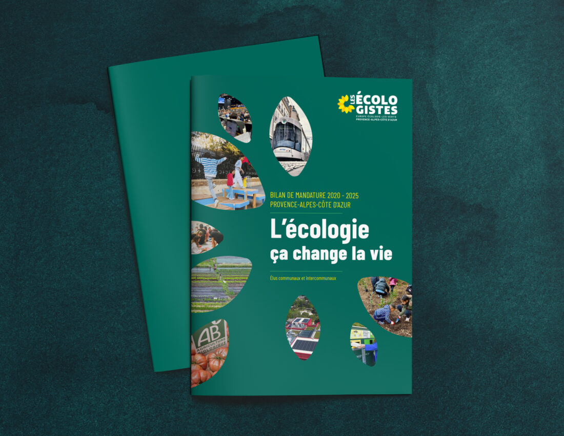 Conception graphique de la brochure de bilan de mandature des écologistes de la région Provence-Alpes-Côte d’Azur. Un système de couleur permet d’identifier une quinzaines de thèmes des différentes actions des élus écologistes parmi les 6 départements de la région.