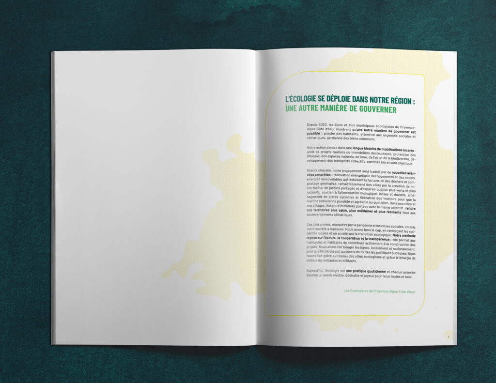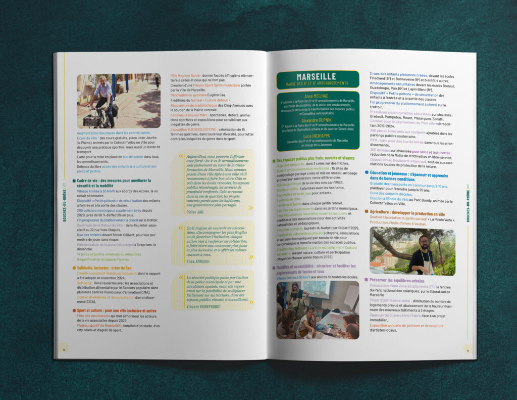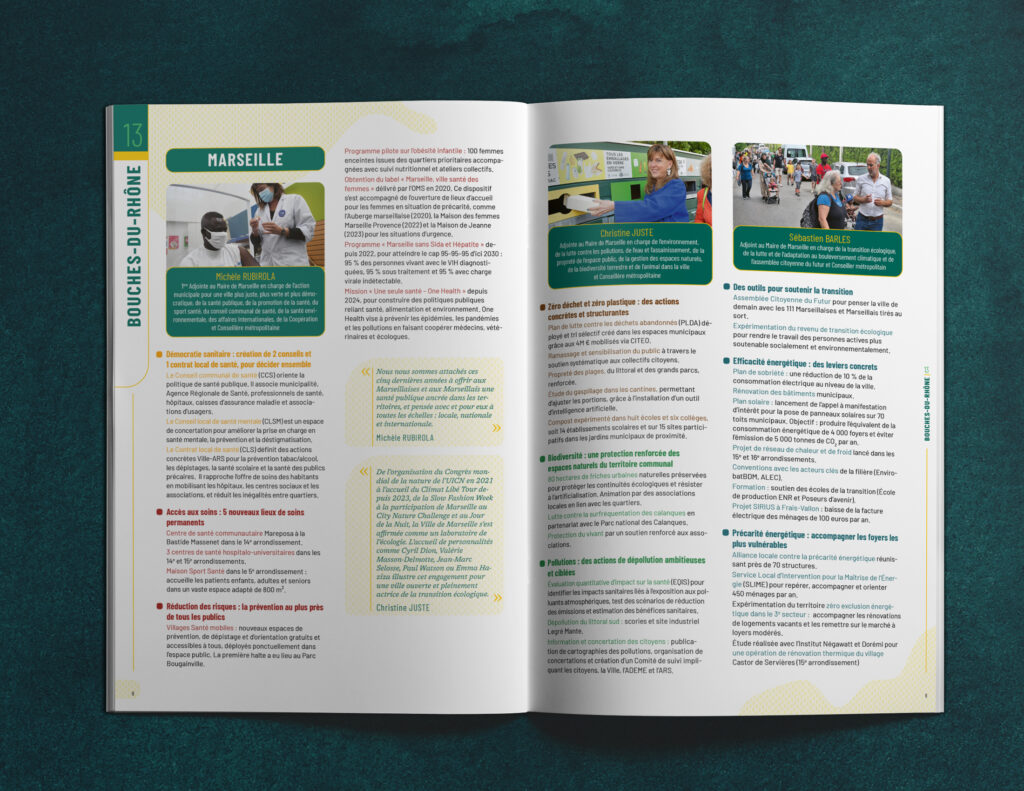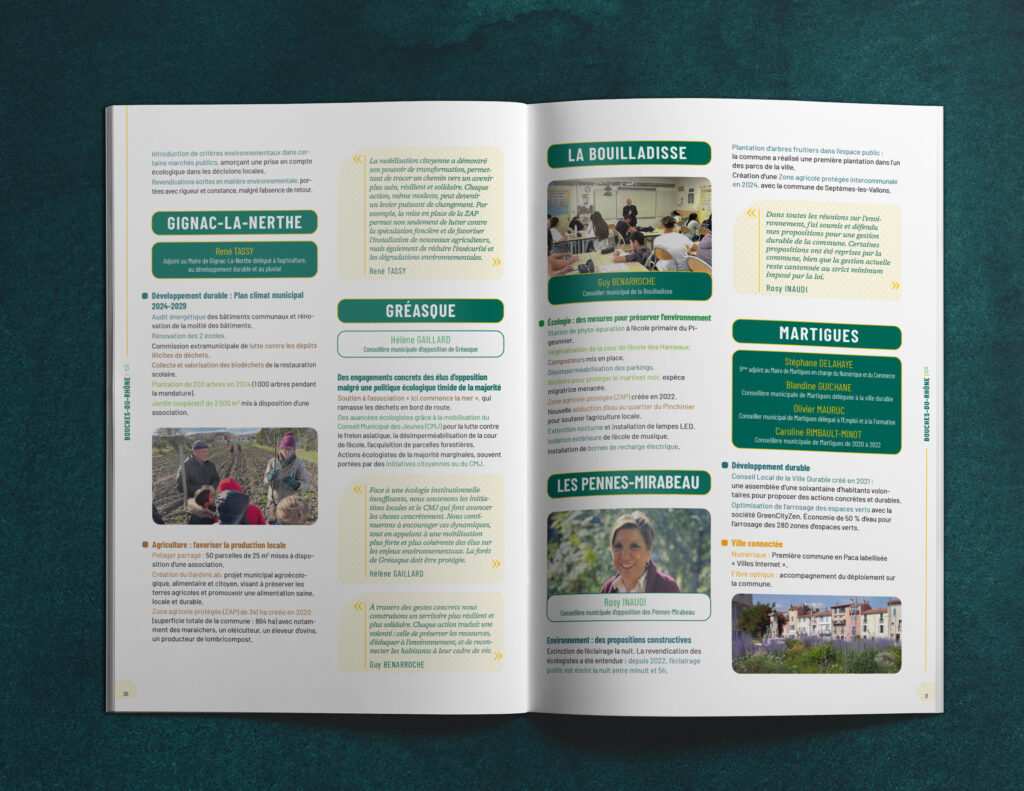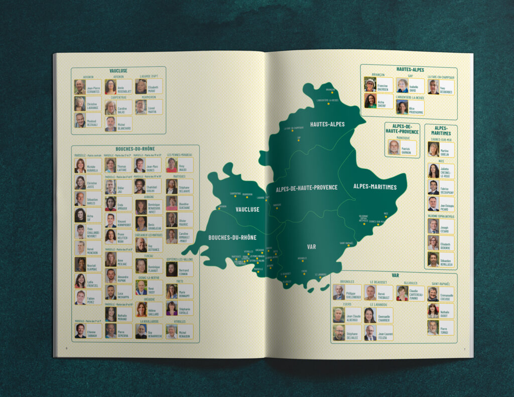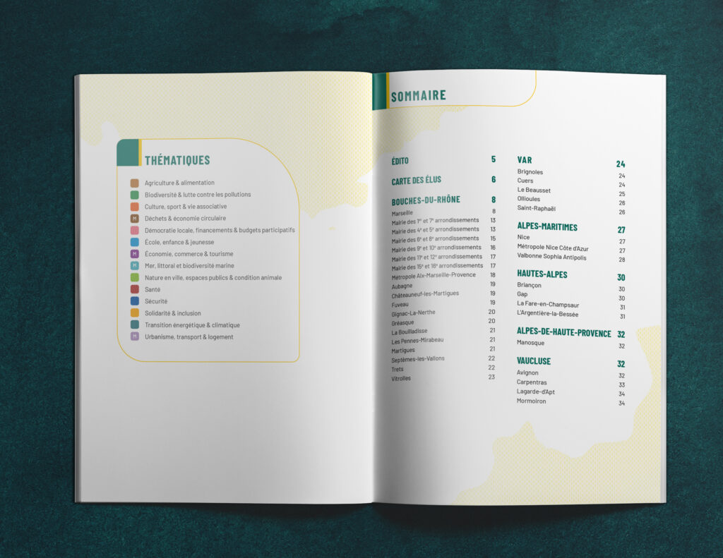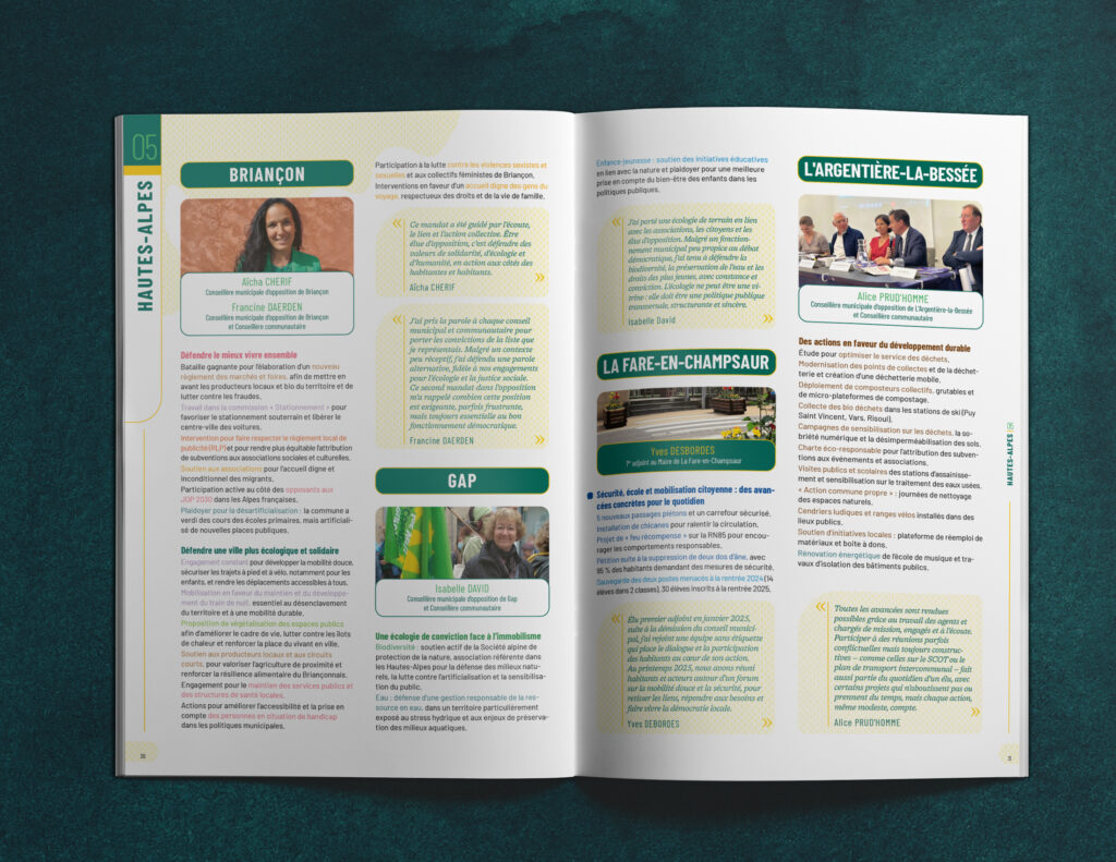 Conception graphique de la brochure de bilan de mandature des écologistes de la région Provence-Alpes-Côte d’Azur. Un système de couleur permet d’identifier une quinzaines de thèmes des différentes actions des élus écologistes parmi les 6 départements de la région.